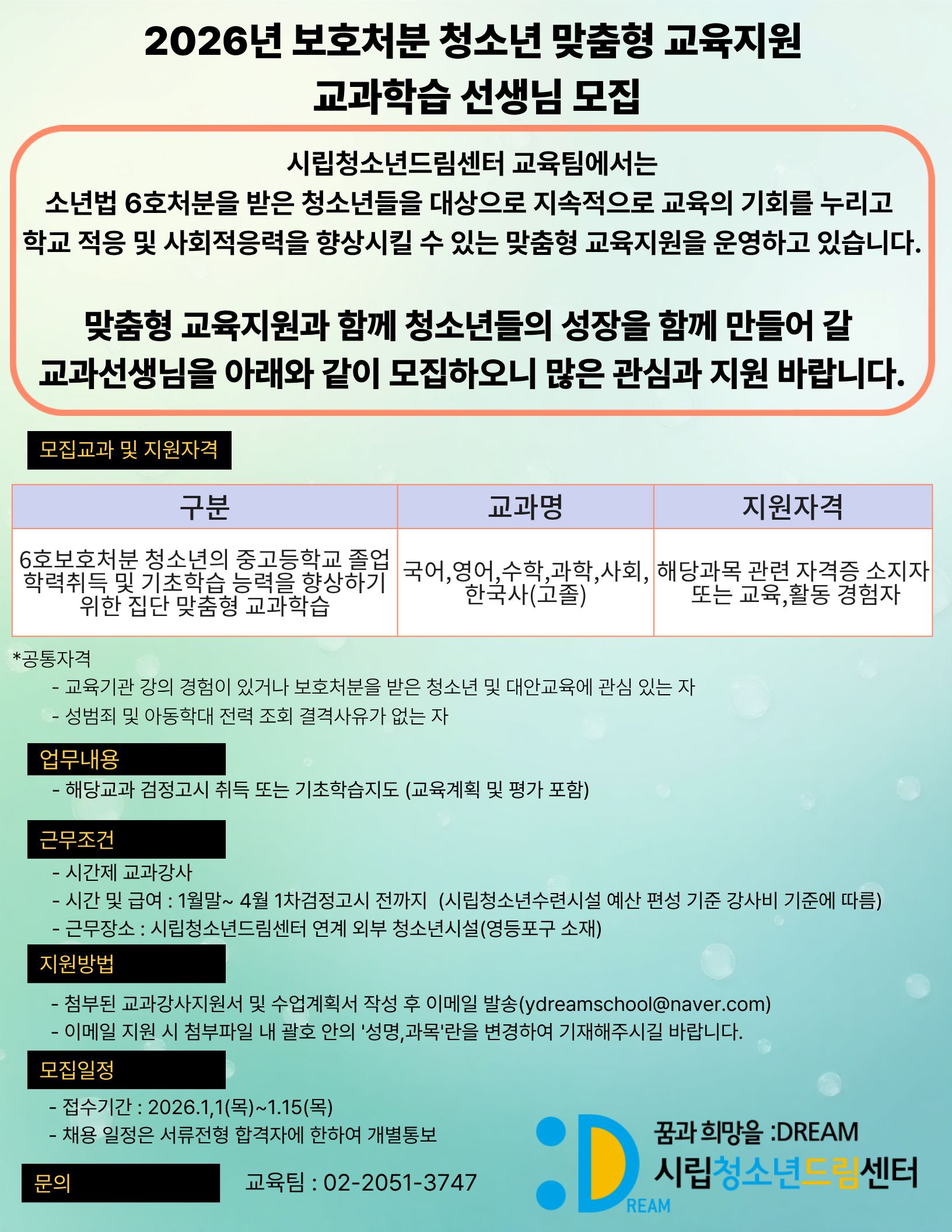 2026년 보호처분 청소년 맞춤형 교육지원 교과학습 선생님 모집
